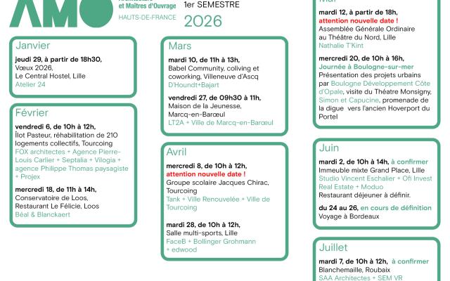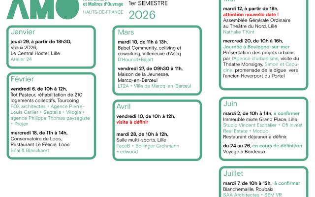 « Architecture et Maîtres d’Ouvrage » Hauts de France est créée en octobre 1985 avec l’ambition de promouvoir un référentiel partagé de qualité architecturale par tous les acteurs de l’acte de construire et de devenir force de proposition et d'interpellation auprès des instances décisionnaires. Cette plateforme d’échanges se matérialise par différentes actions et rencontres : visites de projets, voyages d’études, conférences thématiques, formations. Nous comptons une centaine de structures adhérentes réparties dans des collèges professionnels variés.