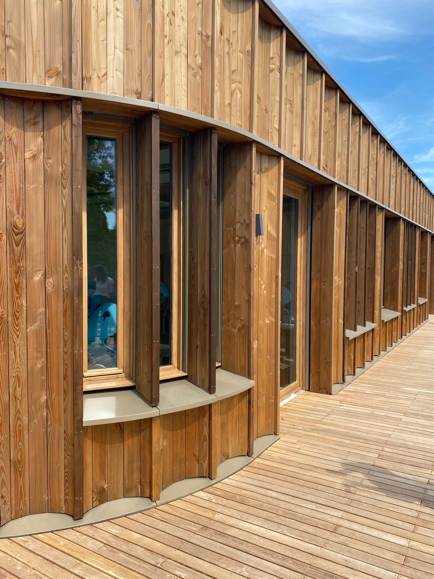 Un système de ventilation naturelle par salle de classe est intégré grâce à des cheminées de ventilation avec récupération de chaleur. Les matériaux sont choisis pour leur pérennité et en adéquation avec leurs usages.