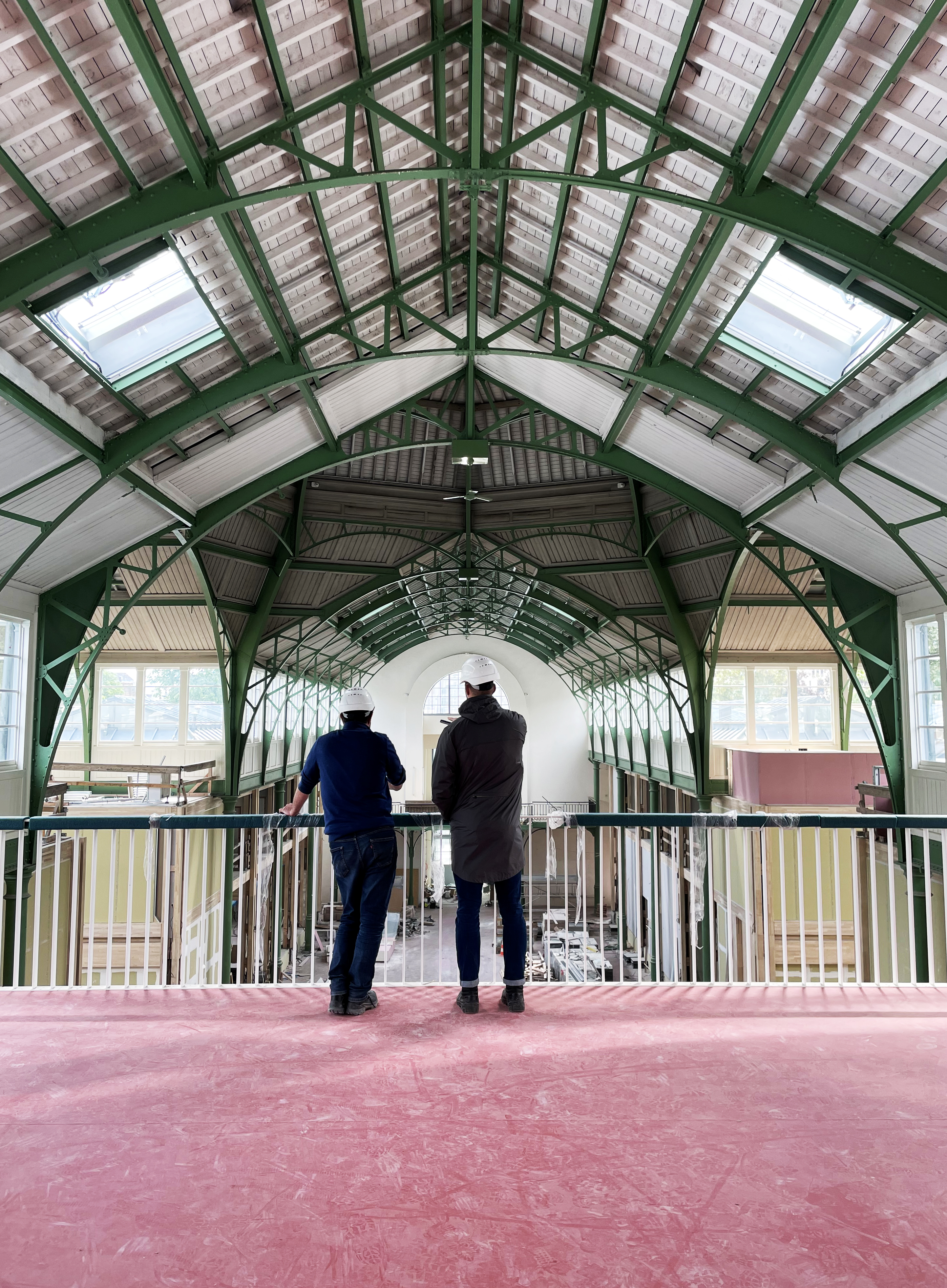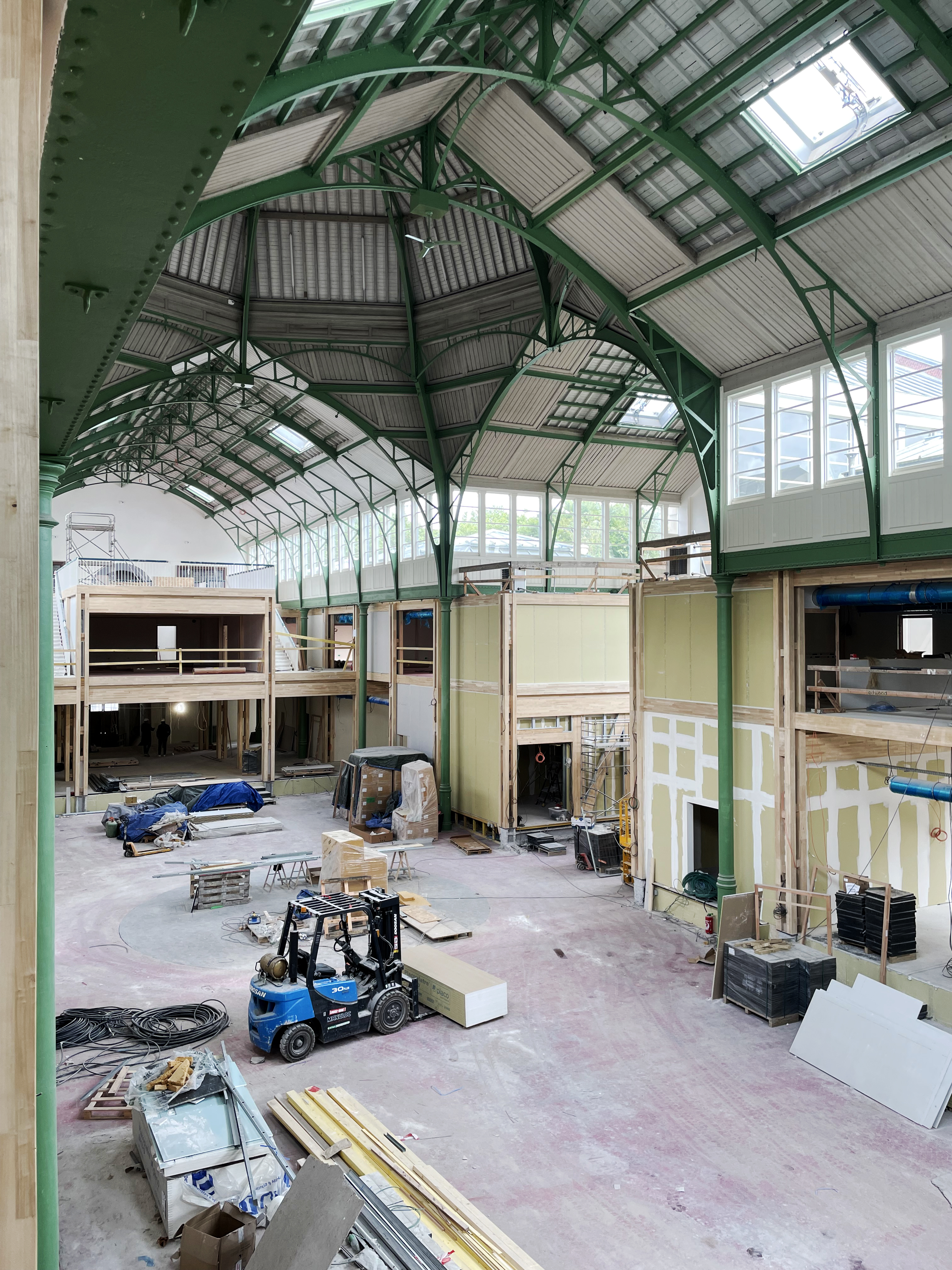 Le projet est matérialisé par une structure en bois réalisée par Edwood, investissant la hauteur des travées latérales en créant deux niveaux de plancher. Ce nouvel aménagement intérieur est séparé de la structure existante, permettant une restitution future du bâtiment dans son ensemble, respectant ainsi le caractère patrimonial du site. Sa composition actuelle et future, en fonction des besoins de l'école, repose sur un système de structure primaire (squelette poteaux-poutres) et secondaire (modules de cloisonnement) apparent, intégrant la dimension évolutive du programme. Objectif programmatique : Faire coexister des espaces de tiers-lieu accessibles au public et des espaces de recherche/formation réservés aux étudiants et chercheurs du Campus.