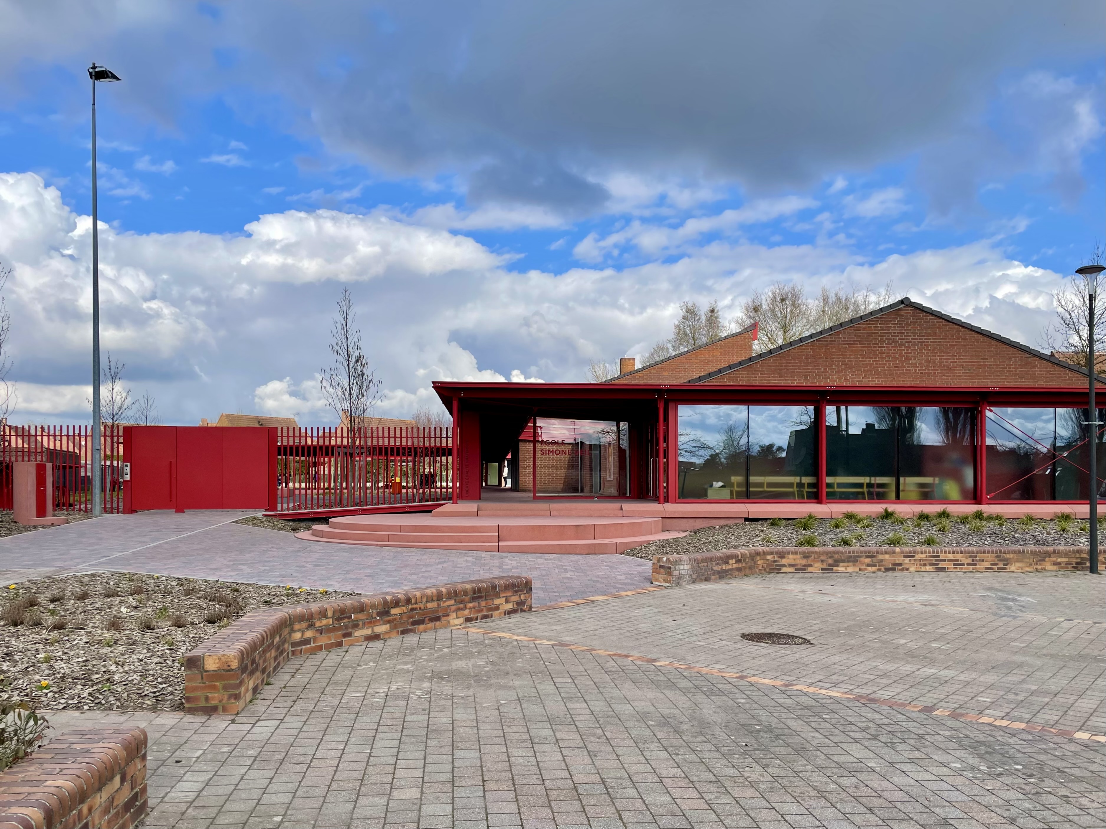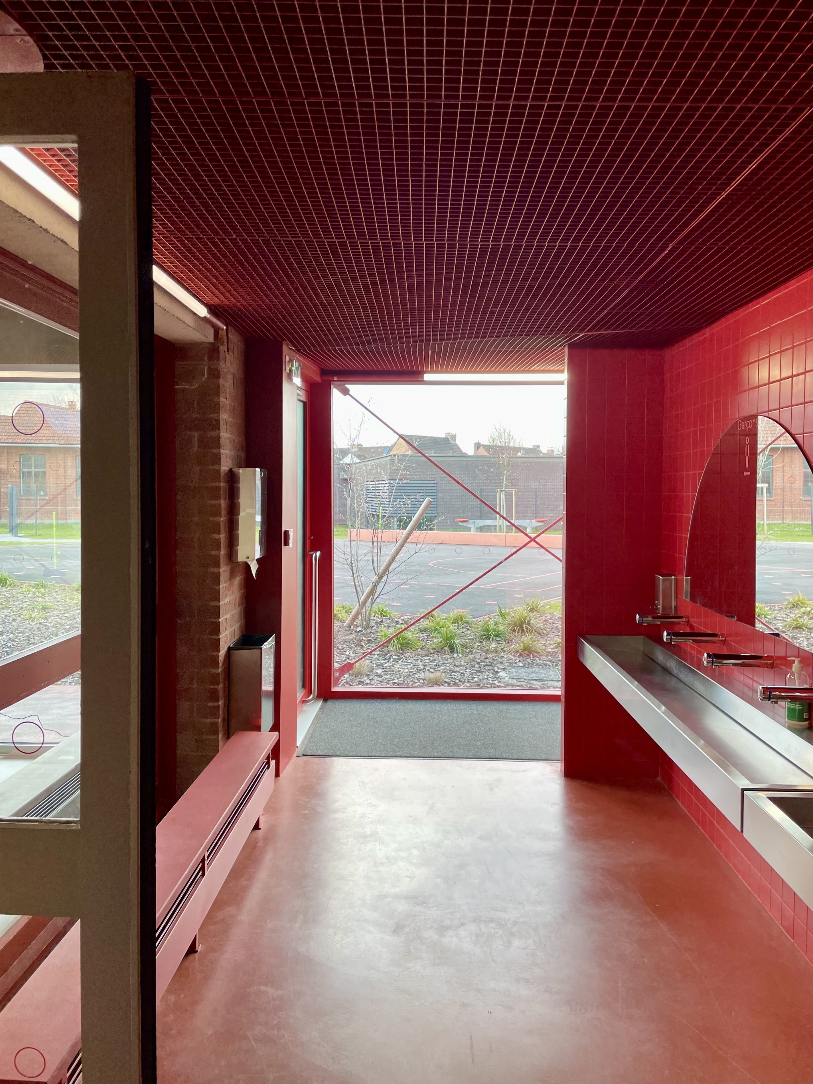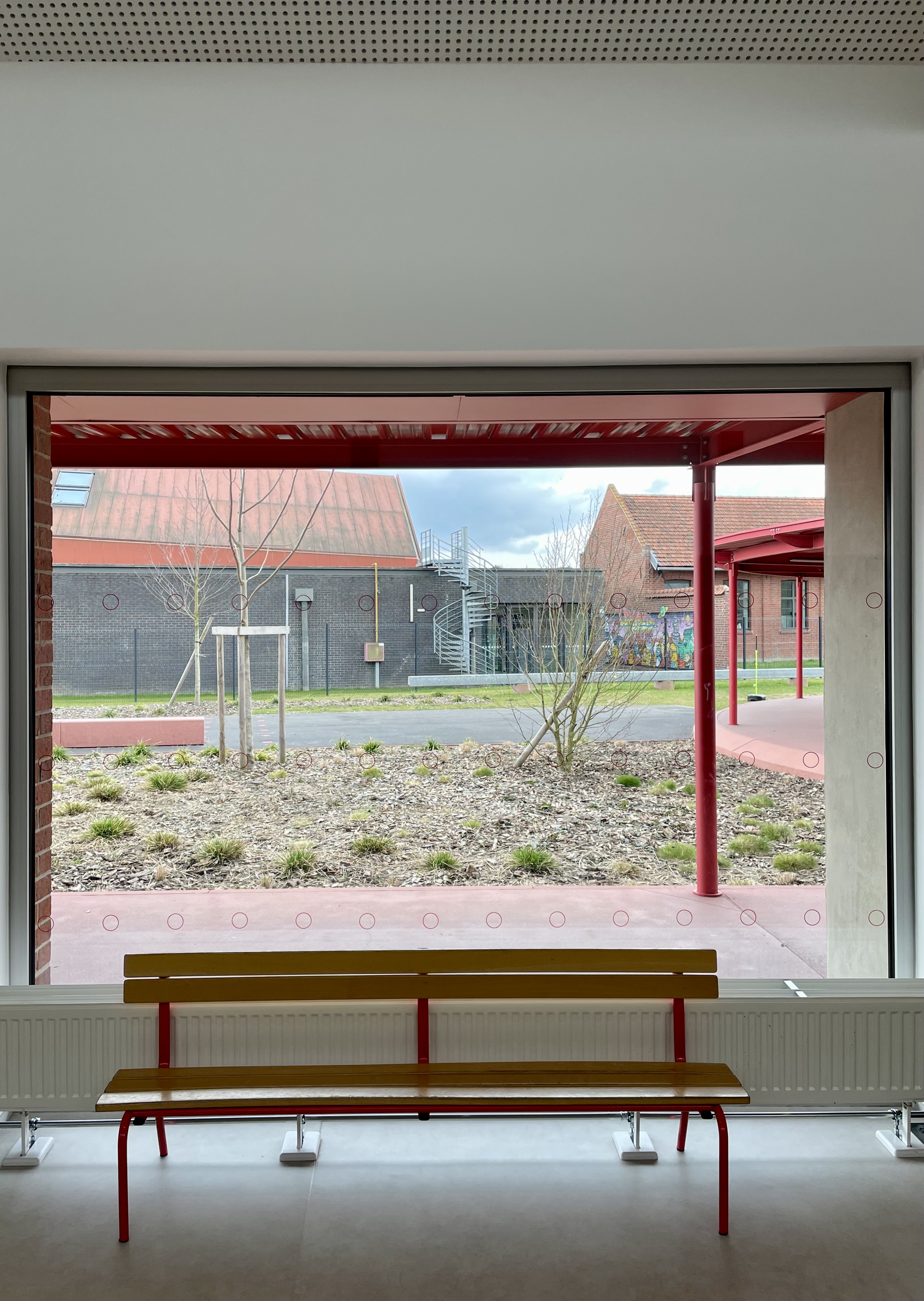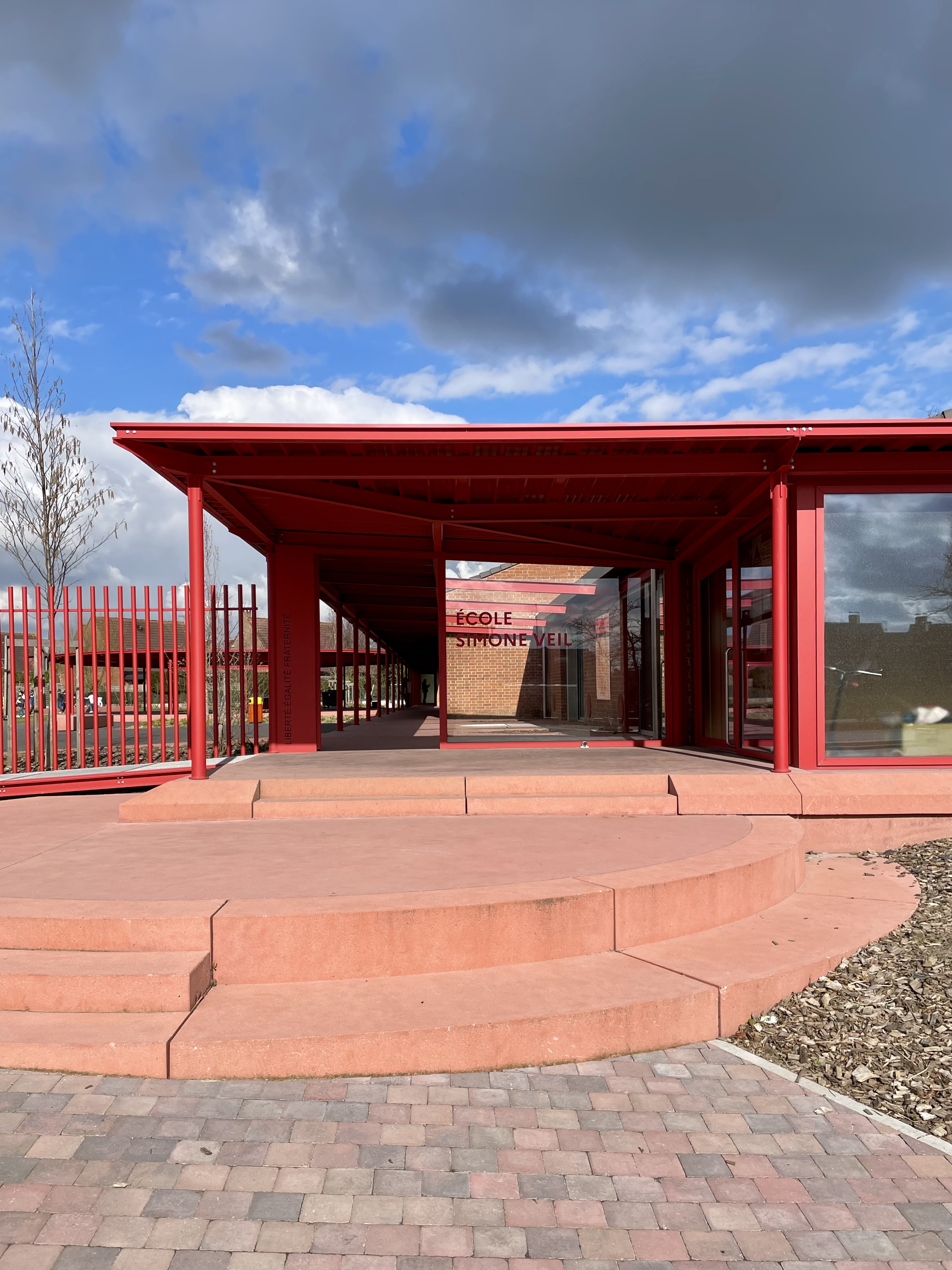 L’école Simone Veil revêt un manteau rouge et épais, à la fois extension et rénovation énergétique, qui entoure les bâtiments d’origine construits dans les années 1980. L’équipement scolaire s’accroche à l’espace public grâce à un socle en béton (teinté dans la masse et sablé) qui rehausse l’édifice de quelques marches sculpturales, formant un promontoire pour le nouveau parvis couvert.