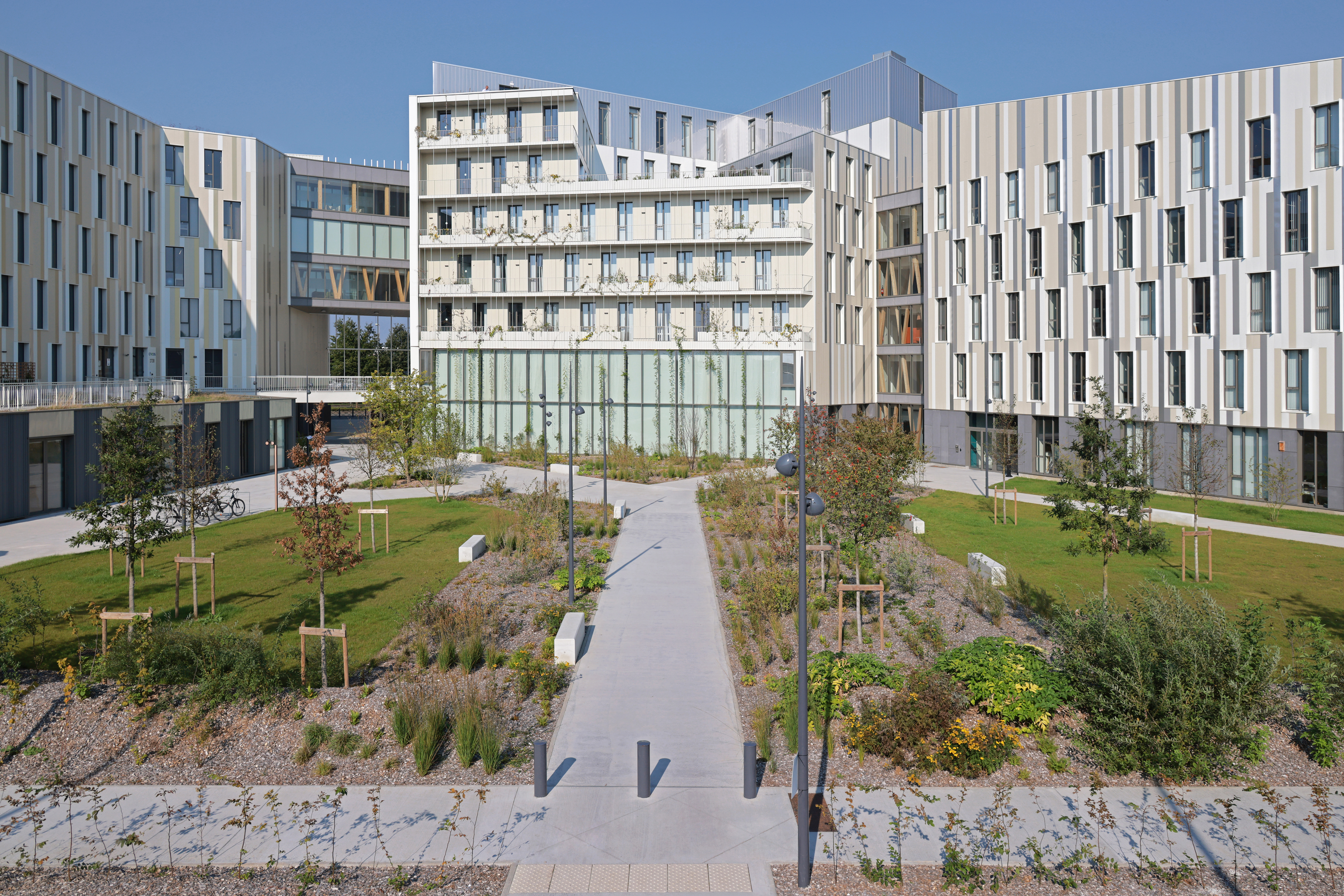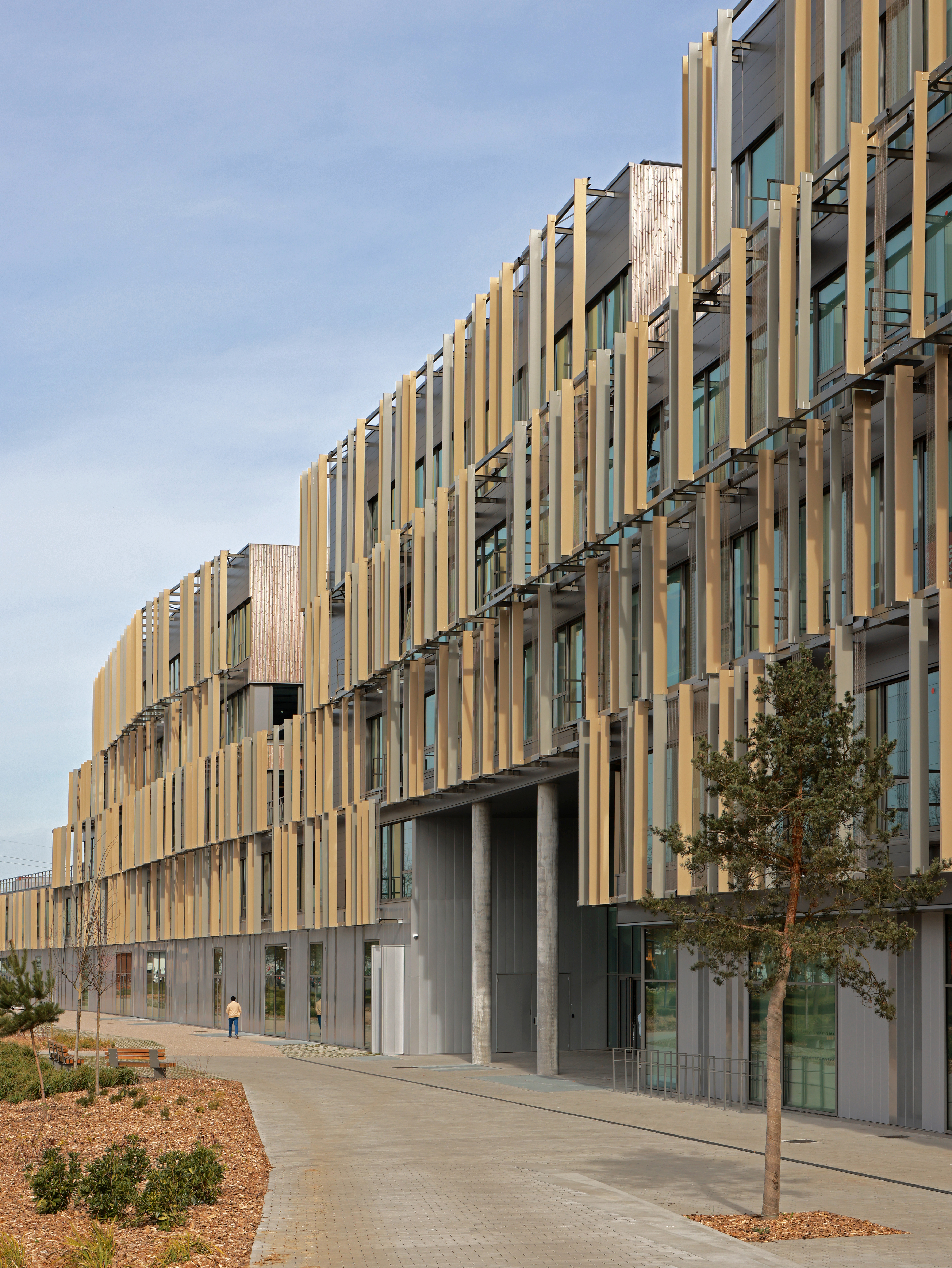 Nous avons commencé la matinée par Hope. Le double programme (HOPE + La Pépite), réparti sur trois bâtiments, représente 17 000 m² (SDP) de bureaux, dont 10 000 m² réalisés en ossature bois et en matériaux biosourcés. Avec une certification BREEAM Niveau excellent, le bâtiment exemplaire conjugue confort d’utilisation et préservation des ressources tant dans sa construction que dans son exploitation. Locaux fonctionnels, décloisonnés, adaptés aux nouvelles manières de travailler. Il offre des conditions de vie au travail de qualité conjuguant bien-être et fonctionnalité.