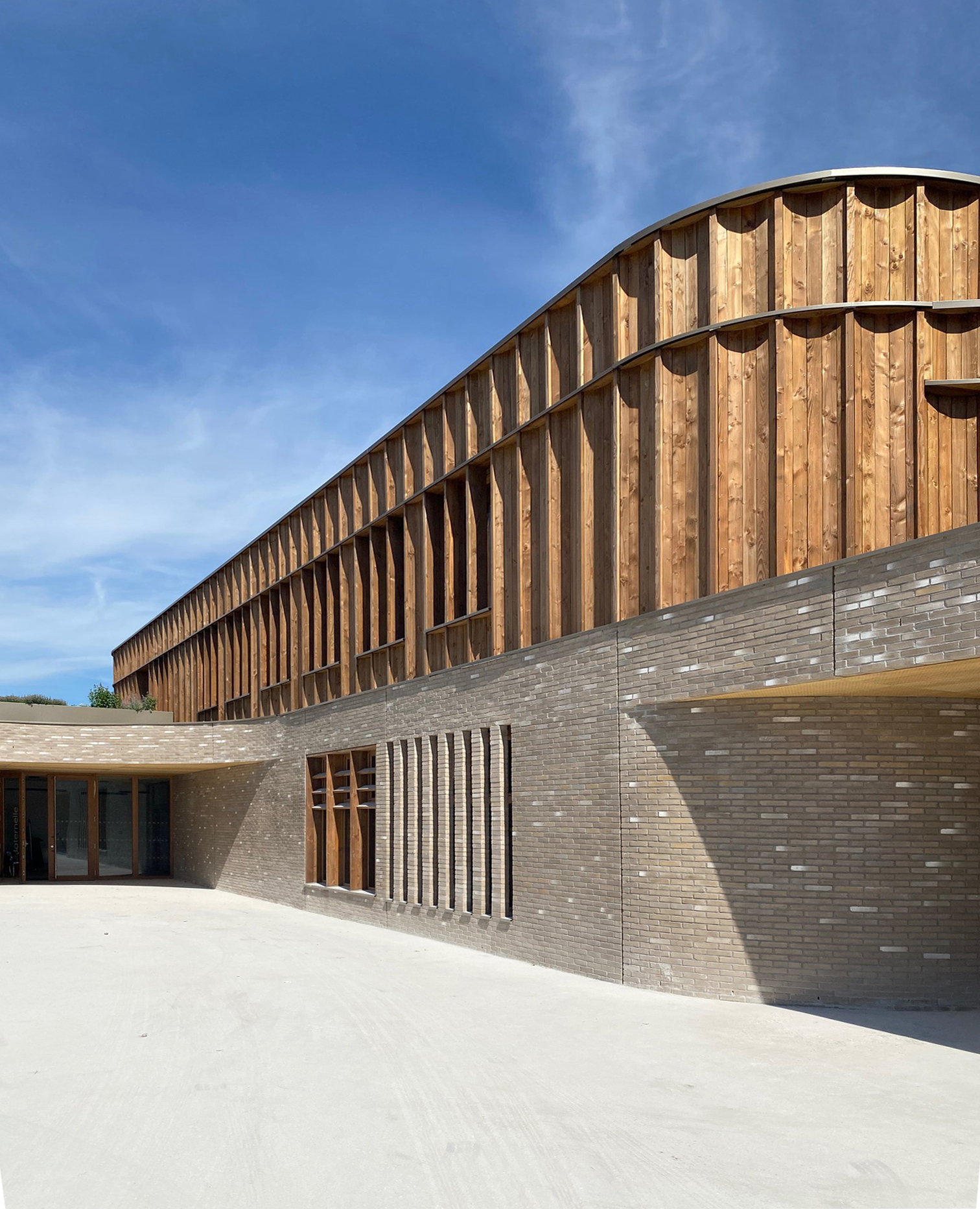 Cet équipement scolaire fédérateur se compose de deux niveaux, un socle en brique et un attique en bois. Le premier niveau en brique dessine et affirme l’alignement avec le futur mail planté.